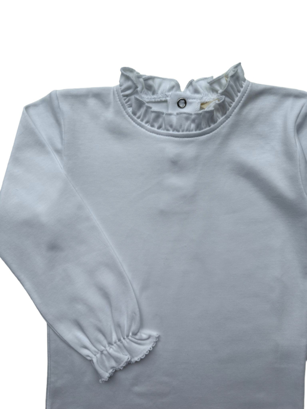 Mooi basic T-shirt van Baby Lai, gemaakt van zacht katoen met een comfortabele pasvorm. De subtiele ruches aan de hals en mouwen geven dit shirt een klassieke en verfijnde uitstraling. Perfect om te dragen of onder een trui, jurk.