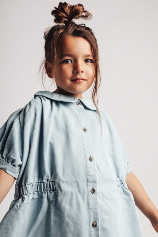 Style Mirabel speels denimlook Deze luchtige jurk in een zachte denimblauwe tint heeft een speelse en tijdloze uitstraling. De knoopsluiting, subtiele kraag en licht gepofte korte mouwen geven het ontwerp een charmante touch. Dankzij de comfortabele pasvorm is deze jurk perfect voor elke dag. Zachte denimlook stof Knoopsluiting aan de voorkant Licht gepofte korte mouwen Comfortabele pasvorm met een kraag die het items stoer maar ook meisjesachtig maakt