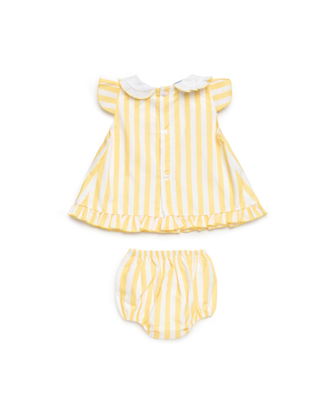Vrolijk babyjurkje in wit met gele strepen, perfect voor zonnige dagen. Het jurkje heeft een ronde kraag met subtiele ruffle-afwerking en speelse kapmouwtjes. De geplooide taille en de ruches aan de onderkant geven het geheel een luchtige en charmante uitstraling. Inclusief bijpassend bloomerbroekje in dezelfde streepprint voor een complete en comfortabele outfit.