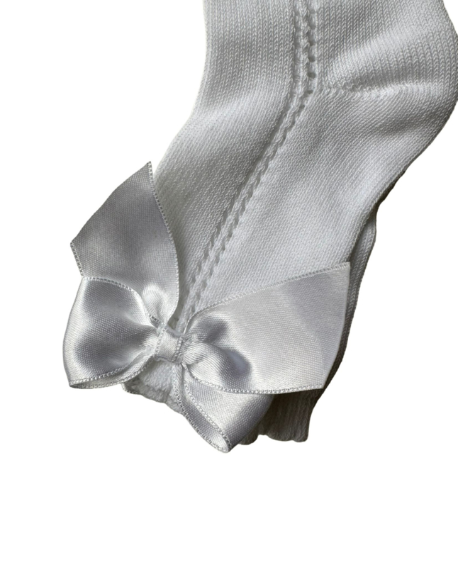 Elegante kniekousen in klassiek wit, afgewerkt met een fijne satijnen strik aan de zijkant. Deze stijlvolle sokken zijn ideaal voor communie, doop, lentefeest of andere feestelijke gelegenheden. De zachte kwaliteit en comfortabele boord zorgen voor een mooie pasvorm en aangenaam draagcomfort.