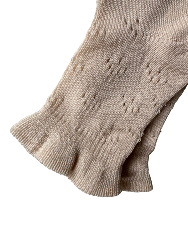 Stijlvolle kniekousen in een zachte beige/nude tint met verfijnd ajourpatroon en subtiele rucherand. Deze elegante sokjes zijn perfect voor feestelijke gelegenheden, maar ook mooi voor een geklede dagelijkse outfit. De zachte kwaliteit zorgt voor een comfortabele pasvorm.