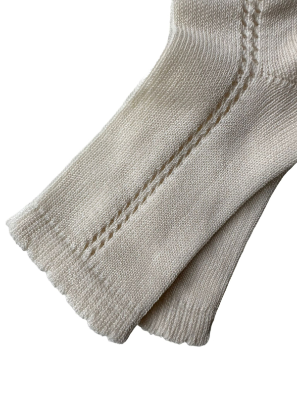 Tijdloze kniekousen in klassiek wit met een fijn verticaal ribdetail en subtiel ajouraccent. De elegante geschulpte boord zorgt voor een verfijnde afwerking. Perfect voor communie, doop, lentefeest of andere feestelijke gelegenheden. Zacht en comfortabel om te dragen.