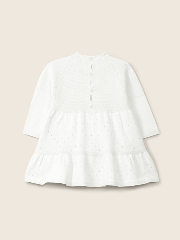 Lief fijngebreid jurkje in een zachte crème tint. Het jurkje heeft een elegante gelaagde rok met subtiel ajourpatroon, wat zorgt voor een verfijnde en klassieke uitstraling. De lange mouwen en zachte kwaliteit maken dit jurkje comfortabel om te dragen, perfect voor zowel speciale gelegenheden als een stijlvolle dagelijkse look.