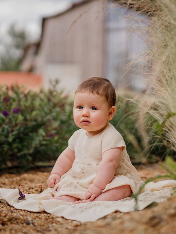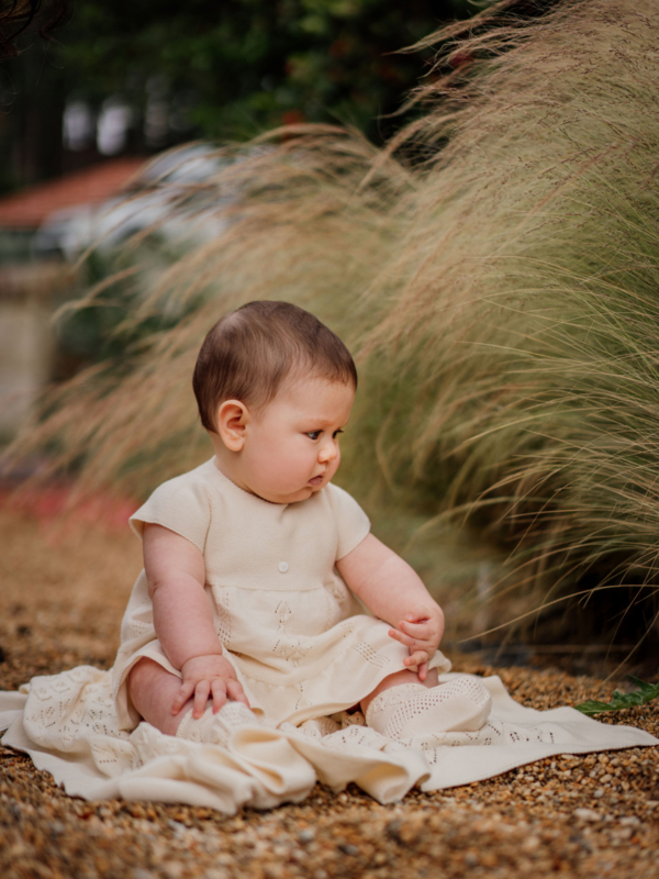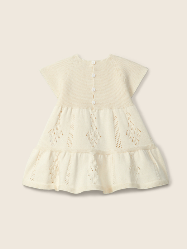 Lief fijngebreid jurkje in een zachte crème tint. Het jurkje heeft een elegante gelaagde rok met subtiel ajourpatroon, wat zorgt voor een verfijnde en klassieke uitstraling. De lange mouwen en zachte kwaliteit maken dit jurkje comfortabel om te dragen, perfect voor zowel speciale gelegenheden als een stijlvolle dagelijkse look.