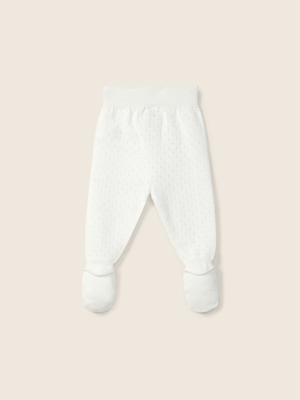Zacht gebreid baby broekje met voetjes in een elegante off-white tint. Het broekje heeft een subtiel ingeweven stippenpatroon en een comfortabele elastische tailleband, waardoor het perfect aansluit zonder te knellen. Dankzij de geïntegreerde voetjes blijven de voetjes van je baby heerlijk warm. Ideaal voor dagelijks gebruik en prachtig te combineren met andere gebreide babyitems.
