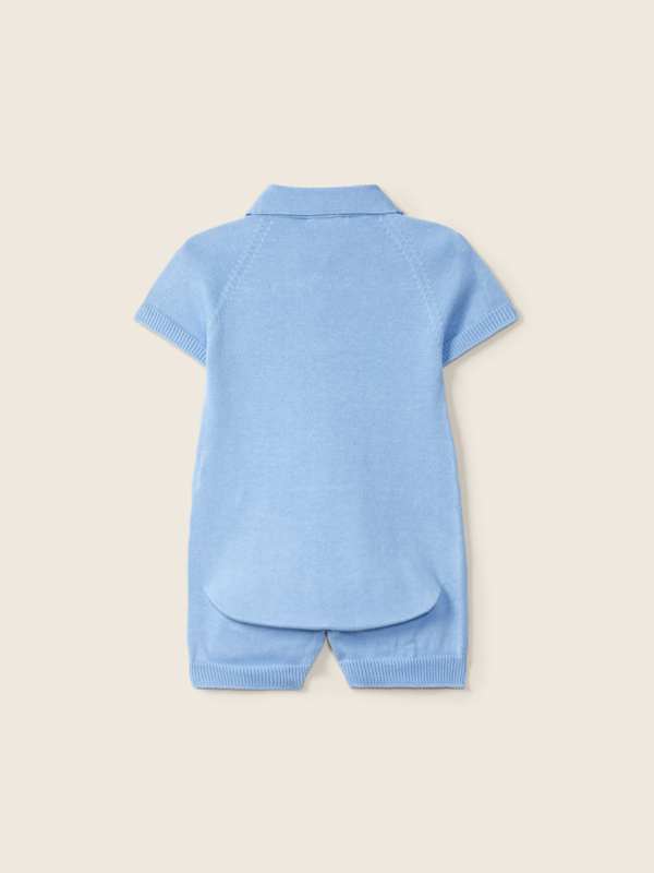 Stijlvolle gebreide baby playsuit in een frisse lichtblauwe tint. Dit comfortabele pakje heeft korte mouwen, een klassiek kraagje en een knoopsluiting aan de voorkant met houten knoopjes voor een tijdloze uitstraling. Het borstzakje geeft het pakje een speels detail. Perfect voor warme dagen en zowel geschikt voor dagelijks gebruik als een nette gelegenheid.