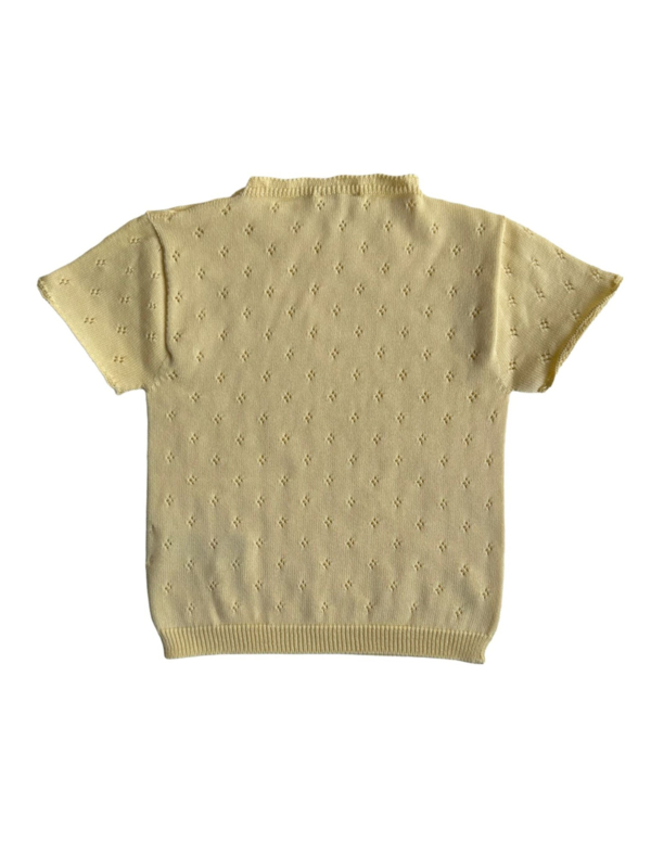 Lief gebreid shirtje in een gele tint met een verfijnd ajourpatroon. Dankzij de lichte en zachte kwaliteit is dit shirtje perfect voor warme dagen en eenvoudig te combineren met een rokje, broekje of bloomers voor een complete outfit.