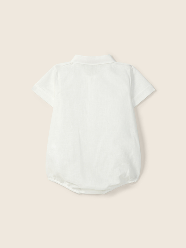 Stijlvolle romper met kraag in een tijdloze witte kleur. De romper heeft een klassieke blouse-uitstraling met knoopsluiting aan de voorkant en een nette kraag, waardoor hij perfect is voor zowel speciale gelegenheden als een nette dagelijkse outfit. Dankzij de zachte, lichte stof en de knoopjes aan de onderkant is de romper comfortabel en praktisch voor het aankleden en verschonen van je baby.