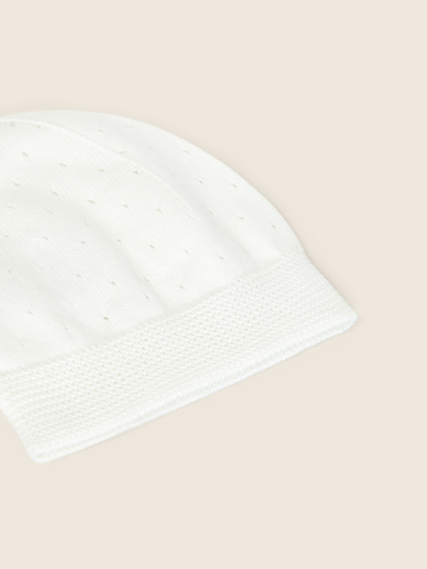Zacht gebreid baby mutsje in een elegante off-white tint. Het mutsje heeft een subtiel ingeweven stippenpatroon en een fijne boord voor een comfortabele pasvorm. Perfect om het hoofdje van je baby warm te houden en ideaal te combineren met andere gebreide babyitems voor een complete, stijlvolle outfit.
