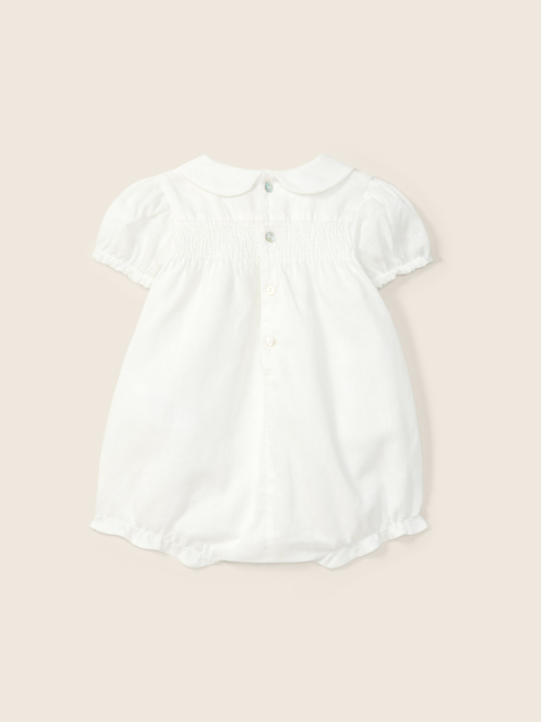 Elegante baby romperjurk in een tijdloze ecru kleur. De romper heeft een klassieke kraag, korte pofmouwtjes en een subtiel gesmockt detail op de borst voor een verfijnde uitstraling. De onderzijde is afgewerkt met een lichte ruffle en praktische knoopjes, waardoor verschonen eenvoudig blijft. Perfect voor zowel speciale gelegenheden als een stijlvolle dagelijkse outfit.