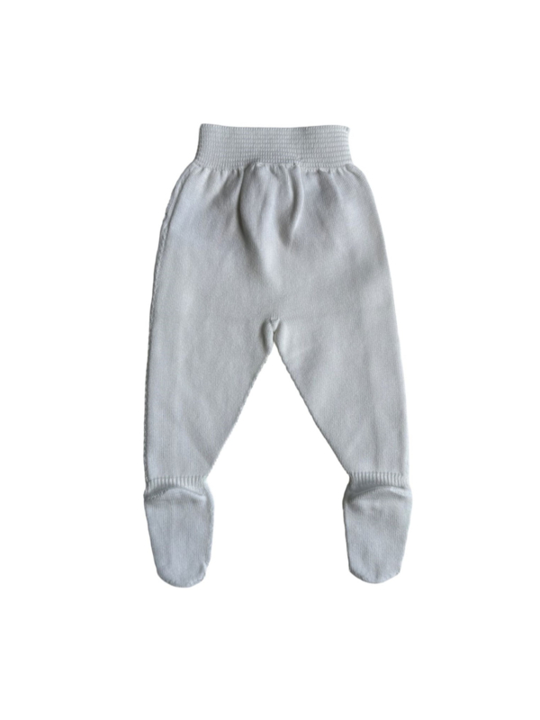 Zacht gebreid babybroekje met voetjes. Het broekje heeft een comfortabele elastische tailleband en verfijnde kabeldetails langs de zijkanten voor een klassieke uitstraling. Dankzij de geïntegreerde voetjes blijven de voetjes van je baby lekker warm. Perfect te combineren met een romper of truitje voor een stijlvolle en comfortabele babyoutfit.