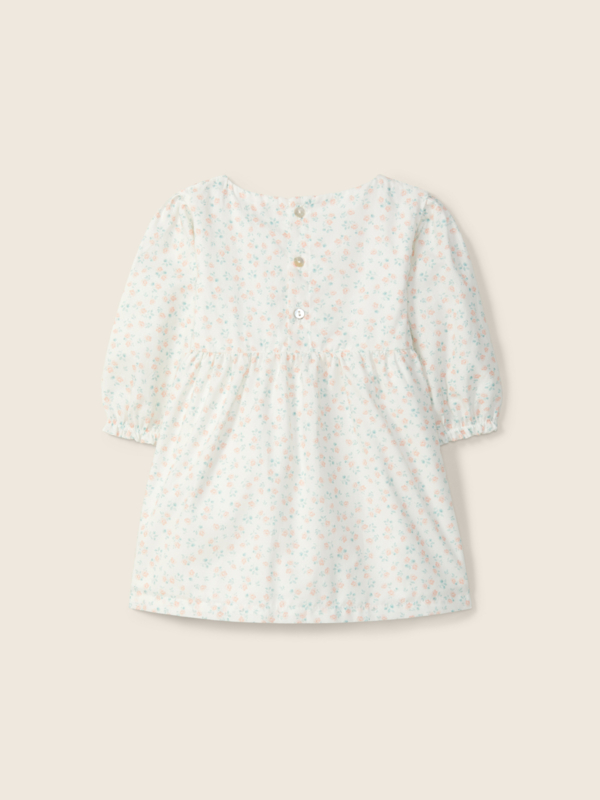Schattig jurkje met een fijne bloemenprint in zachte pastelkleuren. Het jurkje heeft lange mouwen en is een losvallend model, wat zorgt voor een luchtige en vrolijke uitstraling. Het kleine sierknoopje op de borst geeft het jurkje een extra verfijnd detail. Perfect voor warme dagen of een lieve zomerse outfit.