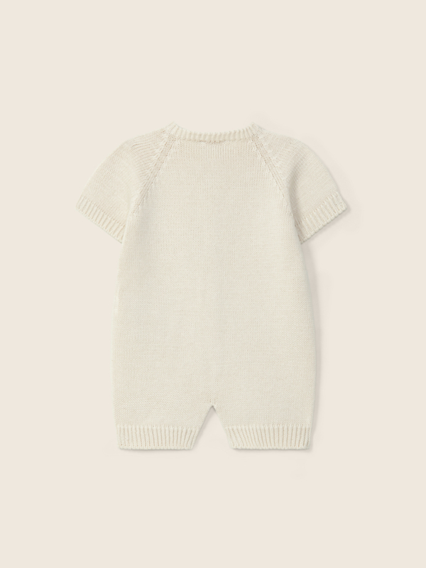Zacht gebreid baby pakje in een elegante crème tint. Dit comfortabele model heeft een knoopsluiting aan de voorzijde en twee kleine zakjes voor een schattig detail. Dankzij de zachte kwaliteit en korte mouwen is dit pakje perfect voor dagelijks comfort en speciale momenten.