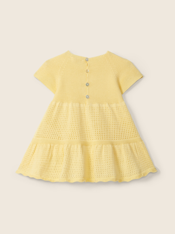 Lief fijngebreid jurkje. Het jurkje heeft een elegante gelaagde rok met subtiel ajourpatroon, wat zorgt voor een verfijnde en klassieke uitstraling. De lange mouwen en zachte kwaliteit maken dit jurkje comfortabel om te dragen, perfect voor zowel speciale gelegenheden als een stijlvolle dagelijkse look.