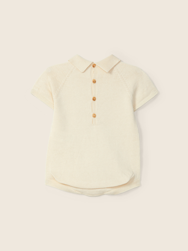 Elegant en zacht gebreid rompertje in een warme crème tint, voorzien van een klassiek kraagje voor een verfijnde uitstraling. De combinatie van het fijne breisel en de subtiele knoopsluiting onderaan maakt dit item zowel stijlvol als praktisch. Perfect voor een nette, maar comfortabele babylook.