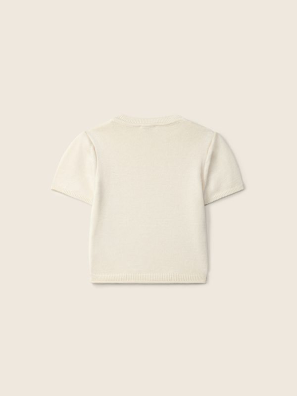 Stijlvol en tijdloos gebreid T-shirt in een zachte crèmekleur. Het minimalistische ontwerp met een subtiel borstzakje geeft dit item een verfijnde en rustige uitstraling. Perfect te combineren voor zowel een casual als nette look.