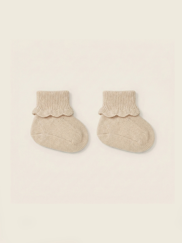Lieve en zachtgebreide babyslofjes in een warme crèmekleur, afgewerkt met een schattig schulprandje. Deze comfortabele sokjes houden de voetjes lekker warm en geven elke outfit een verfijnde, klassieke touch.