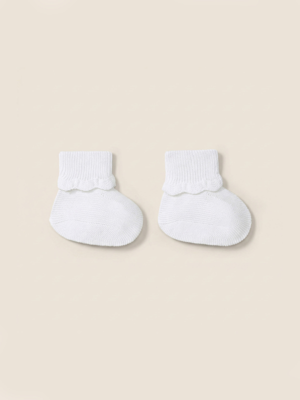 Lieve en zachtgebreide babyslofje, afgewerkt met een schattig schulprandje. Deze comfortabele sokjes houden de voetjes lekker warm en geven elke outfit een verfijnde, klassieke touch.